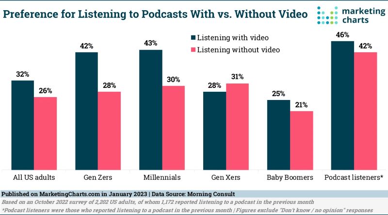 Según una investigación realizada por la compañía Morning Consult en Estados Unidos, los usuarios actualmente prefieren consumir los pódcast en formato de video. También se debe a un tema generacional, puesto que la audiencia Gen Z creció en un mundo bastante audiovisual, así que según la encuesta el 42% de ellos prefiere los videopodcast, mientras que el 28% prefiere solo el audio.